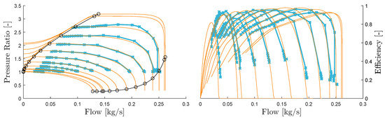 Compressor flow and efficiency map model fit for a Mitsubishi TD04 compressor. Measurement data is given in blue and the model in orange, the left plot shows the flow versus pressure ratio characteristics and the right shows efficiency. The curves represent constant compressor speeds evenly spaced between 60 and 160 krpm.