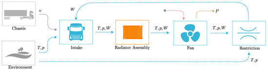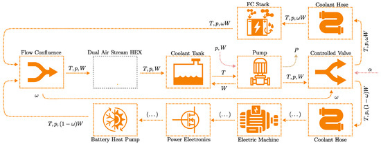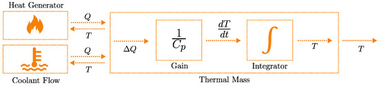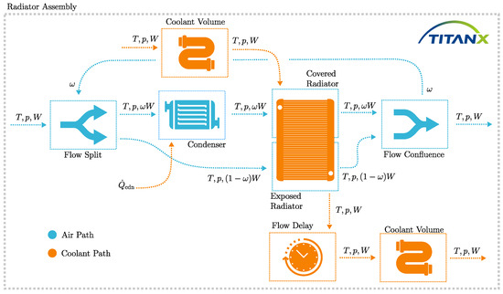 For laminar flow in pipes, the correlation of Haussen from [35] is used to calculate average Nusselt numbers and heat transfer coefficients. For some components, the temperature gradients and changes in the coolant fluids are not modeled explicitly but are assumed to be equal to the outflow coolant. In those cases, the heat generated/removed by the component is added/subtracted to the coolant, which results in a temperature increase/decrease. For components with significant thermal inertia, the temperature is modeled according to the diagram in Figure 7. The radiator’s overall heat transfer coefficient is modeled using the Effectiveness-NTU approach [35], assuming unmixed cross-flow conditions. The radiator model and its parameters were implemented based on a library provided by TitanX.