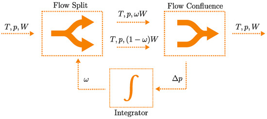In contrast to the fluid dynamic models in the gas exchange systems, incompressibility assumptions are used throughout the cooling system for both air and coolant. Flow through component models either heats or cools the fluid, which alters the outlet temperature. Simple pressure drop equations are used to calculate pressure loss through the component. Flow-splitting devices, such as valves, require a flow-split fraction as input. The split fraction is calculated at the point of confluence and is controlled to equalize pressures in each fluid path as shown in Figure 8. The technique is used for both radiator air and coolant flows and allows for signal flow in one direction.