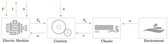 Signal flow of Example 1. Inputs are a torque demand to the electric machine (EM) and a gear selection to the gearbox. The electric machine produces a torque, which is transferred through the gearbox to the wheel. The vehicle acceleration is governed by a force balance between the tractive force and driving resistance forces acting on the chassis. The dominant resistive load is the gravitational force, which acts on the vehicle according to the road slope.