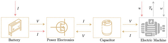 The second example vehicle aims to demonstrate the battery and power electronics models. A signal flow chart of the battery electric truck powertrain is shown in Figure 11, in addition to the flowchart described for Example 1 in Figure 10. The simulink implementation of Example 2 is shown in Figure A6. The battery current is an input to the system, and it is controlled such that the bus voltage tracks a constant reference. A DC converter boosts the battery voltage to the bus voltage level, and the capacitor acts as a buffer for the DC-bus voltage during power transients, when the electric machine consumes or produces current from the DC-bus.