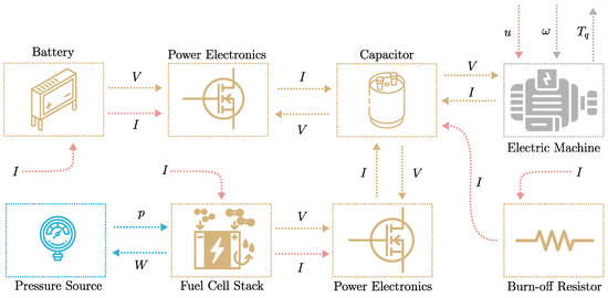 Signal flow of Example 3, where a fuel-cell system with stack and power electronics is added to the system. This example illustrates the properties of the electric vehicle if the vehicle is fuel-cell dominant or battery dominant.