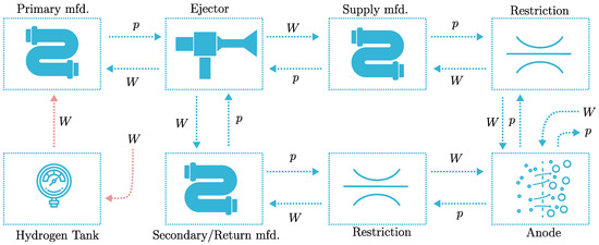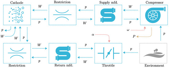 Several balance of plant (BOP) components are required to provide reactant chemicals to the anode and cathode at appropriate rates. On the anode side, the main component is the ejector, and on the cathode side, the compressor. A signal flowchart of the anode and cathode gas exchange systems is shown in Figure 13 and Figure 14. Fuel is stored at high pressure in the hydrogen tank. The flow from the tank to the primary manifold is an input to the model. The primary manifold is typically pressurized between 5 and 10 bar. Hydrogen flows through the ejector and, by the Venturi effect, draws exhaust gas from the secondary manifold into the supply manifold. The inlet and outlet to the anode chamber are modeled as flow restrictions. The state in the anode chamber volume is given as input to the fuel-cell voltage model. The supply and secondary manifold represent the combined volumes of pipes and hoses from the ejector to the fuel-cell stack.