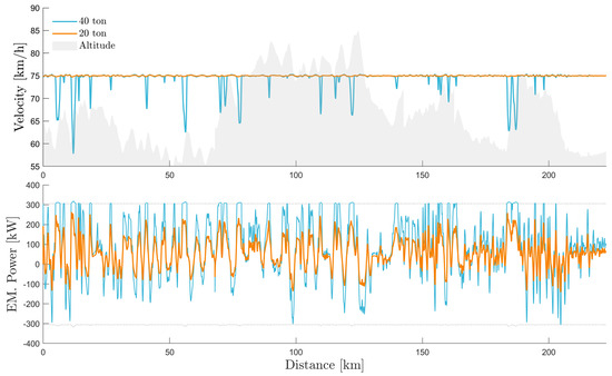 The results for Example 1 are shown in Figure 18. The 20-ton truck is able to follow the velocity reference quite well during the entire mission, while when the 40-ton truck climbs steep hills, its speed is reduced. Analyzing the power of the electric machine, for the 40-ton truck, it is seen that the power (and torque) limit is reached at several points during the mission. In order to improve the speed reference tracking for the 40-ton truck, either the motor power limit needs to be increased, or, a more sophisticated shifting strategy can be implemented.