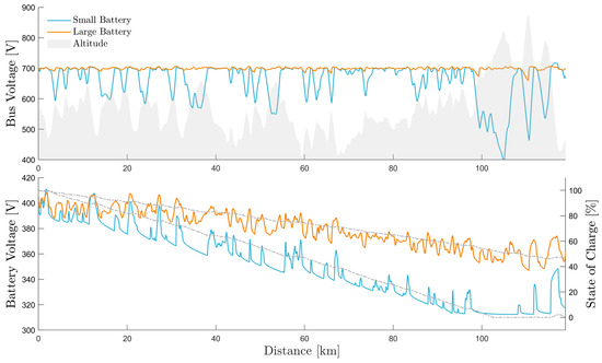 A comparison between battery trucks with small and large battery packs and their impact on range and DC-bus voltage reference tracking. The dotted lines in the lower graph correspond to the state of charge of the respective cases.