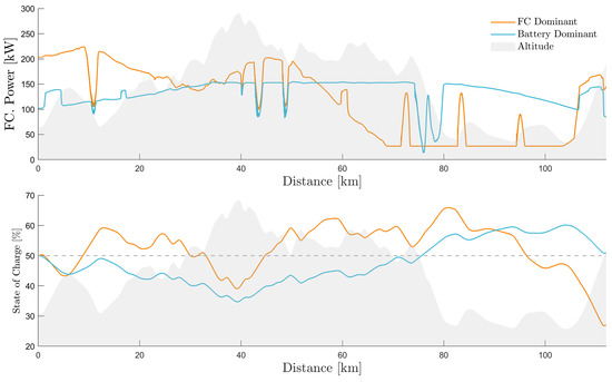 A comparison between battery- and fuel-cell-dominant vehicle configurations, showing the fuel-cell output power and state of charge. The dotted line in the lower graph highlights the 50% reference level.