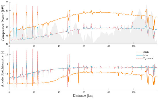 As shown in Figure 4, the cell power density increases with pressure. Higher pressure ratios, however, also require more work from the compressor. There is a trade-off between pressure and efficiency, and in this case study, three settings for the reference pressure are considered: 2.5 bar, 3.5 bar, and a dynamic strategy that controls the reference pressure according to the short-term fuel-cell current adjustment explained in the previous example.