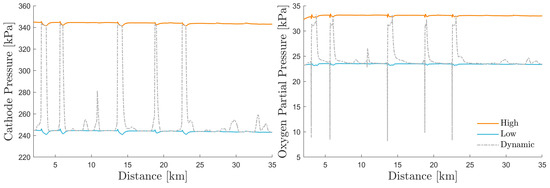 The dynamic pressure reference strategy is designed to increase the concentration of reactants in the anode and cathode during high-load operation. Initially, if only the total pressure is considered it seems that the strategy is successful, as shown in Figure 22. The total pressure in the cathode increases from the low to the high reference level as the current demand is increased. However, when the throttle closes in order to increase the cathode pressure, oxygen is simultaneously depleted at a higher rate, causing depletion spikes as seen in Figure 22, which may be harmful to the device. This phenomenon shows that pressure control strategies should be designed with care.