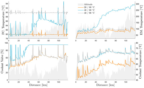 The results for Example 5 are shown in Figure 23. At an ambient temperature of 20 °C, the cooling system maintains FC and EM temperatures at the desired levels. Only late in the driving mission does the fuel-cell temperature-tracking error exceed three degrees. When the ambient temperature is increased to 40 °C, the radiator’s ability to remove heat is drastically reduced. The coolant valve diverts 100% of the flow to the fuel cell, which causes the EM to overheat. If the fuel-cell reference temperature is increased to 90 °C, the temperature difference between the fuel cell and coolant becomes large enough for sufficient heat transfer to occur.