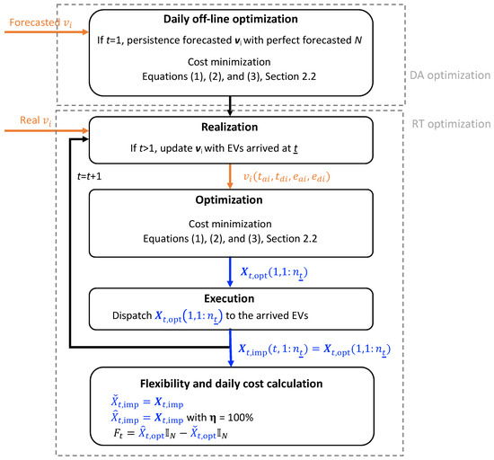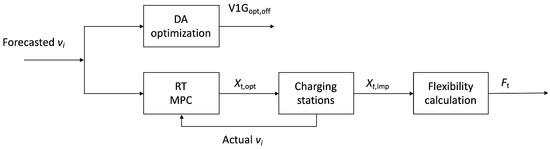 Figure 1 presents the model flowchart consisting of DA/offline optimization and RT optimization using a model predictive control (MPC) algorithm. In the optimization, the inputs are a set of forecasted EV arrival and departure times and the energy levels of the EV battery. From the arrival and departure time of EV i, (, ) (see the nomenclature at the end for all variable definitions), the plug-in duration is calculated. As the model resolution is 15 min, to be conservative, all arrival times are rounded up and departure times are rounded down to the next quarter hour, respectively. From the arrival and requested departure battery energy of EV i, (, ), the total session energy is calculated. From the charger power rating, the constraint of the maximum interval kWh that can be delivered to EV i during the plug-in duration can be calculated. Note that in reality, without ISO 15118 [17] implementation, the arrival energy is a vehicle property and is unknown and the session energy and departure time are driver inputs and are uncertain. In addition to the algorithm flow chart (Figure 1), a control block diagram is also presented in Figure 2.