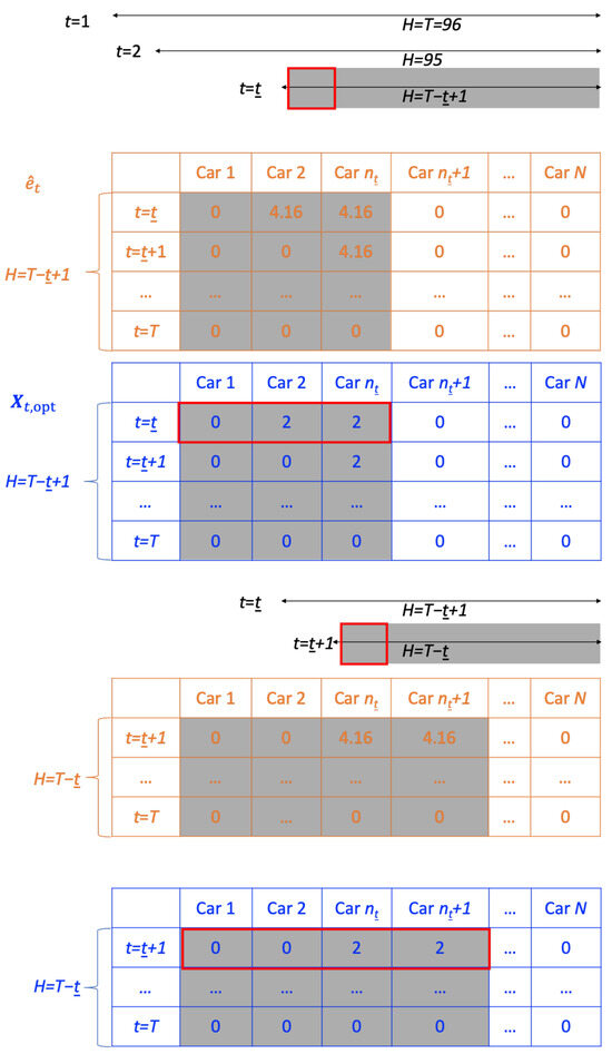 The online feedback process in the RT optimization model is illustrated in Figure 3. The number of time steps in the MPC simulation horizon is H. At time , the time stamp of the day, both input and output matrices have H time steps, where , which cover the time period from the following timestep until the end of the day. The orange input matrix is the constraint of the maximum interval energy capacity of the charger for each EV during its plug-in duration, called the availability matrix, (Equation (3)). The orange matrix represents the maximum energy an EV could receive in each time interval. At time , when EVs have arrived, the first columns of the availability matrix are calculated based on the actual arrival and departure times (gray shaded entries), and the rest of the columns are calculated based on the persistence forecasted EV arrival and departure times.
