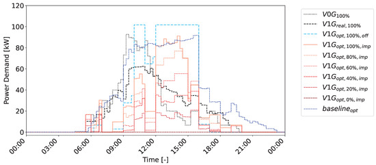 Figure 4 shows the actual and simulated aggregated EV loads with different control schemes and different service levels on 7 December 2022. The simulated (uncontrolled) dumb charging, with 100% service level, is denoted as V0G100% (dotted black); the actual PowerFlex controlled, 100% service level load profile of the day is denoted as V1Greal,100% (dashed black). PowerFlex operates chargers based on [25], but since actual site demand charges are not assessed only by the EV charging load, the optimization function differs and the optimization performance in this paper does not reflect the skill of the PowerFlex algorithm. The smart persistence forecasted offline optimal load with 100% service level, as the output of the DA optimization, also referred to as the forecasted optimal load, is denoted as V1Gopt,100%,off (dashed light blue). The baselineopt (dashed blue) is the average of the V1G optimal implemented load over the previous 10 weekdays (in the simulations) with 100% service level. We assume market participation during hours when the baselineopt is higher than the forecasted optimal load. Baselineopt is referred to as the dispatch baseline in the rest of the paper.