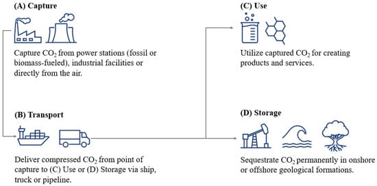 Within the realm of CCUS, significant sources of CO2 emissions originate from power generation facilities, whether they are fueled by biomass or fossil resources. Furthermore, CCUS encompasses the potential for the direct capture of CO2 from the atmosphere. Once captured, the compressed CO2 can be transported through a variety of channels, including pipelines, ships, railways, or trucks, and subsequently employed for various applications if it is not immediately used upon capture. Additionally, CCUS offers the option of injecting CO2 into deep geological formations, such as saline reservoirs or depleted oil and gas reservoirs, providing a secure and enduring repository for the stored CO2 [4]. Figure 1 provides a schematic representation of the CCUS value chain. Currently, CCUS facilities operating worldwide possess the capacity to abate more than 40 million metric tons (Mt) of CO2 equivalent annually.