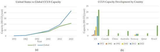(a) Capacity comparison of CCUS facilities in the US and globally over 50 years and (b) CCUS projects in terms of its capability by each country [3].