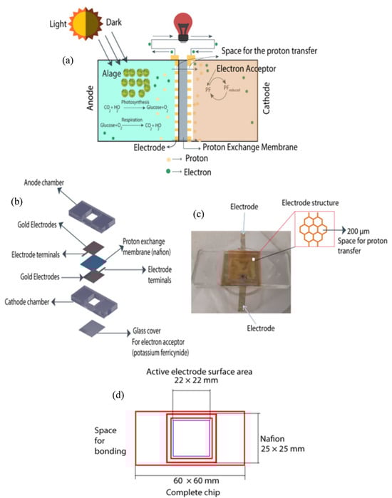 The principle of operation of the µPSC is the natural photosynthesis and respiration process. The µPSC involves the membrane electrode assembly sandwiched between the anode and cathode chambers. In the anode, photosynthesis drives the water-splitting reaction and releases electrons. In contrast, in the respiration process, electrons are also released by the catabolic activity of the photosynthetic microorganisms. These electrons traverse through electrodes in the membrane electrode assembly. Figure 1a demonstrates the principle of operation of the µPSC. As the detailed principle of operation is presented in our previous works, the authors recommend referring to [3,8,11].