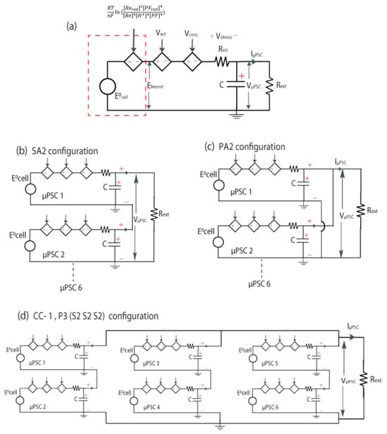 The electrical equivalent circuit of the single µPSC is shown in Figure 2a [29]. In the Nernst reversible voltage, of the µPSC is modelled as DC voltage source and reactants and products were modelled as controlled voltage source, which is the function of the rate of change in the anode and cathode species concentration. The rate of change of species concentration is the solution of a set of first-order differential equations [28]. Both the activation and concentration voltage losses were modeled as controlled voltage sources. The Ohmic loss is represented as the resistive element. The proton exchange membrane is modeled as a capacitor. The resistive load is connected to the terminals of the µPSC [29]. Figure 2b shows the electrical equivalent model of the two µPSCs in series connection and Figure 2c shows the electrical equivalent model of the two µPSCs in parallel connection. Figure 2d shows the electrical equivalent circuit of a combination of series and parallel connections of the µPSC.