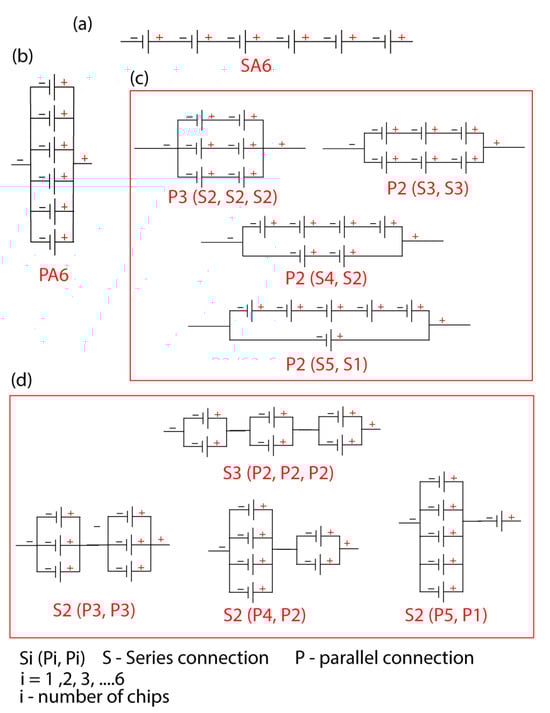 In the SA6 configuration, the µPSCs were connected in series connections. The six µPSCs were all connected in series (Figure 3a).