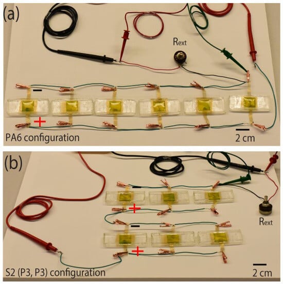 In the PA6 configuration, the µPSCs were connected in parallel. The first µPSCs anode and sixth µPSCs cathode terminals were connected to the DAQ for the current and voltage sensing (Figure 3b). The photo image of the PA6 configurations is shown in Figure 4a.