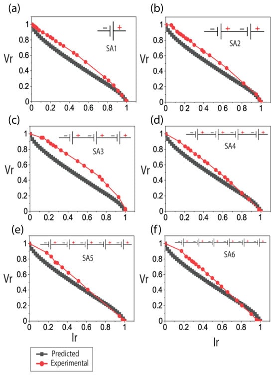 Normalized I-V characteristics of SA6 configuration, (a) SA1 configuration, (b) SA2 configuration, (c) SA3 configuration, (d) SA4 configuration, (e) SA5 configuration, (f) SA6 configuration. Red circle lines represent the experimental results; black squares represent the simulated (predicted values).