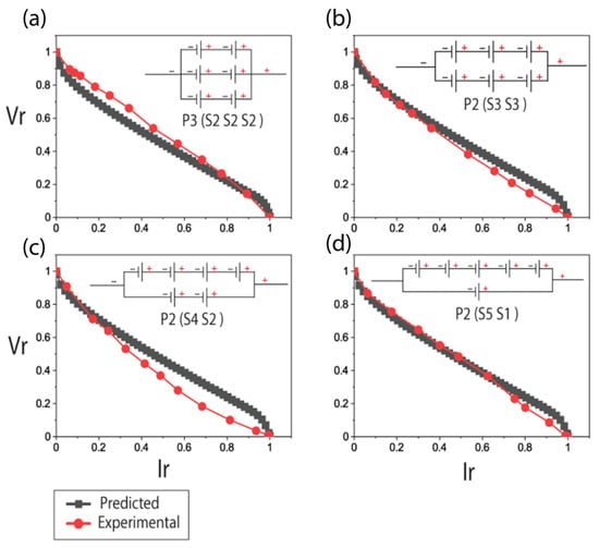 Figure 6c shows the normalized I-V characteristics of the [P2 (S4, S2)] configuration. The predicted effective terminal voltages were slightly lower than the experimental value, perhaps because of the increase in the voltage in the long-term performance (Table 3) [10]. Figure 6d shows the normalized I-V characteristics of the [P2 (S5, S1)] configuration. The effective terminal voltages of the experiment were almost close to the predicted values. However, the effective currents of the experiment were quite lower than the predicted ones.