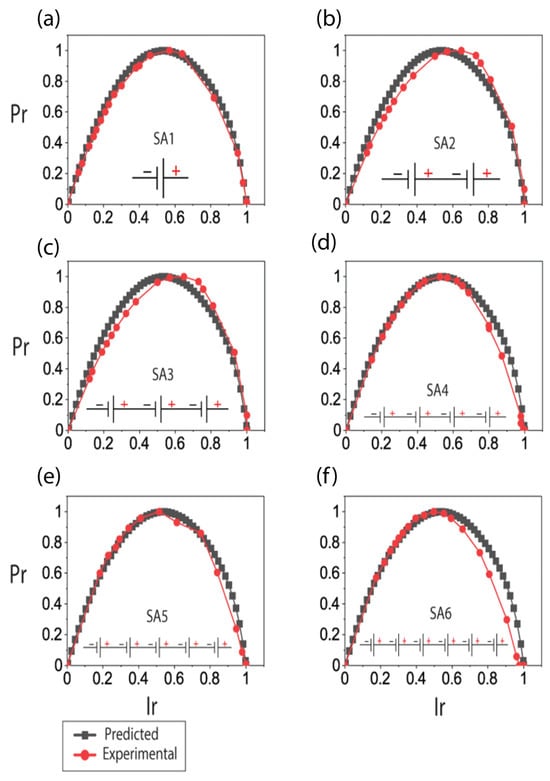 Normalized I-P characteristic curves SA6 configuration. (a) SA1 configuration, (b) SA2 configuration, (c) SA3 configuration, (d) SA4 configuration, (e) SA5 configuration, (f) SA6 configuration. The circles represent the experimental results; black squares represent the simulated (predicted values).