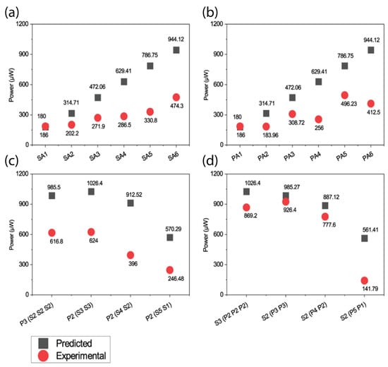 Pmp is the highest power generated from the µPSCs. Figure 8a demonstrates the Pmp of an array of µPSCs in the SA6 configuration. According to the model, it was observed that the maximum power increased with an increase in the number of µPSCs in the series connection. For the SA2 configuration, the model has predicted a Pmp of 359.9 µW, whereas the experimental value has shown 202.2 µW (Table 1). The lower experimental value was mostly perhaps because of the inconsistent performances of the µPSCs and ohmic losses in the circuit. The six µPSCs in series connection have a predicted Pmp of 1079.9 µW. Overall, in the series connection of µPSC, the Pmp has observed an increasing trend.