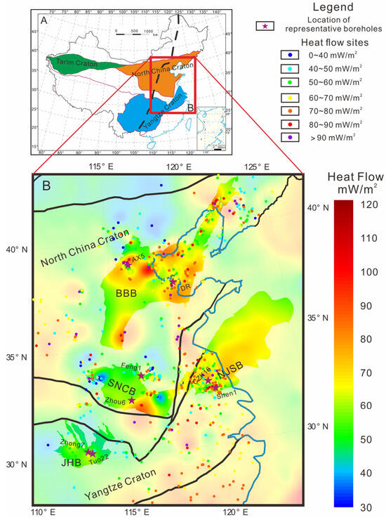 Tectonic background and geothermal heat flow map of the cratons in East China. The heat flow data in the figure are sourced from [19,20,21,22], and we refer to to [19] for the construction of boundaries. The bold, black, dashed lines in (A) represent the North–South Gravity Gradient Zone. In (B), we have made the areas outside the North Jiangsu Basin (NJSB), the Bohai Bay Basin (BBB), the Jianghan Basin (JHB), and the Southern North China Basin (SNCB) 70 percent transparent in our geodetic heat flow map in order to differentiate the thermal backgrounds of the priority study areas.