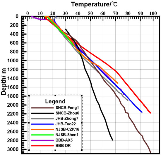 The cratons in East China mainly host two sets of geothermal reservoirs: shallow Cenozoic clastic rock reservoirs and deep carbonate rock reservoirs. Our compilation of representative temperature–depth curves for different tectonic units in the study area (Figure 2) indicates significant variations in reservoir temperature and geothermal gradients among different tectonic units. At a depth of 1000 m, the temperatures in BBB and NJSB can reach 50–60 °C. This is followed by the JHB, which has a slightly lower temperature. SNCB displays the lowest temperature, around 40 °C. As depth increases, temperature generally shows a gradual upward trend. At equivalent depths, temperatures are the lowest in SNCB, followed by slightly higher values in JHB, and NJSB and BBB exhibit highest temperatures.