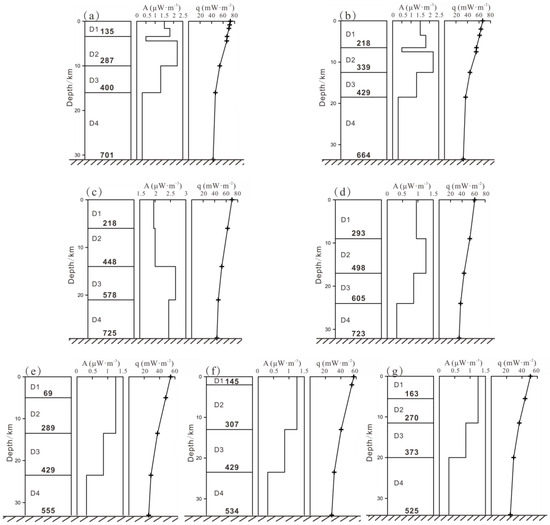 Here, denotes the thermal conductivity at room temperature, and b and c are identified as experimental constants. To secure the optimal fitting parameter values, experimental outcomes from [62] (b1 = 0.0015 K−1) were applied for correcting the upper crust, while those from [63] (b2 = 0.0001 K−1) were employed for correcting the middle–lower crust and mantle lithosphere. When temperature surpasses 800 °C, a value of c = 1 × 10−10 W·m−1·K−4 was applied to correct the radiative thermal conductivity [64].