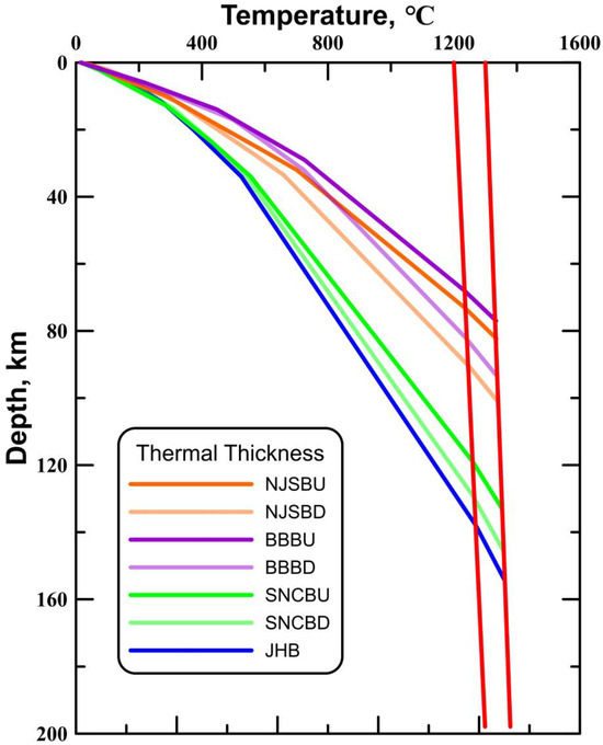 In the prevalent literature on the temperature distribution at different depths, the metric of lithospheric thermal thickness is derived by defining the base of the lithosphere as the solidus temperature of the mantle, approximated at 1200 °C [65], 1250 °C [66], or 1300 °C [67], or through comparison with the solidus line of basaltic rocks [68]. We utilize Equations (4) and (5) to delineate the upper and lower bounds of the lithospheric insulation line, thereby determining the thermal thickness [69]: