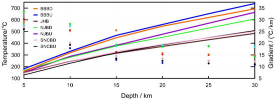 Temperature and gradient values versus depth of main tectonic units in cratons in East China. (The lines and dots represent variations in temperature and gradients, respectively).