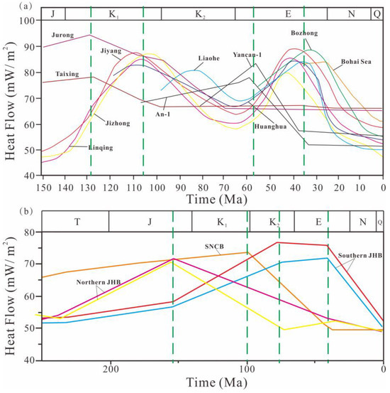 In the JHB’s northern part, around 157 Ma, the ancient heat flow peaked at 72 mW·m−2. During the Late Cretaceous to Paleogene period, some boreholes evidenced a resurgence in heat flow increases again. Late-stage tectono-thermal events were predominantly observed in the JHB’s southern part, occurring between 78 and 43 Ma, during which the heat flow remained at higher background values (71–76 mW·m−2). Since the late Eocene, the heat flow values in the JHB have gradually decreased.