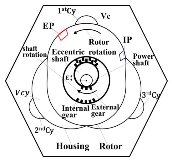 Figure 1 shows a cross-sectional view of the GP3 RTE core, showing the eccentric power shaft, rotor, and housing arranged in sequence from center to radial direction. The rotor rotates counterclockwise as the eccentric shaft rotates clockwise, always touching the three housing apexes, resulting in an eccentric rotation. The external and internal gears at the power shaft and rotor sides, respectively, were designed such that the rotor rotates once while the power shaft rotates twice. The rotor corresponds to the RE piston, with geometry based on an epitrochoidal function with two lobes. The housing inner circle is shared by three lobes, spaced 120° apart, with shapes determined by the eccentrically rotating rotor’s outermost trajectory. The three cavities, along with clearance volumes between the rotor and housing, correspond to the RE cylinder volume, Vcy. Hence, a single GP3 RTE effectively incorporates three cylinders, each with a combustion chamber, Vc, hollowed at the top central region for each cylinder.