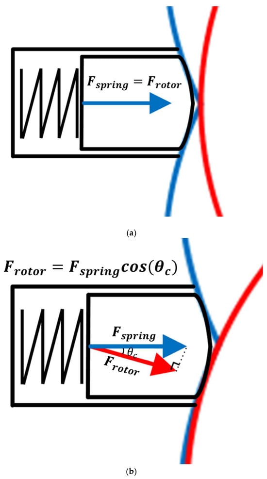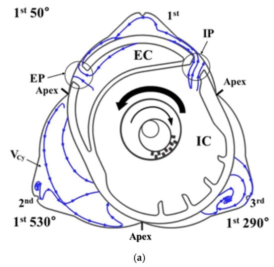 For example, when the rotor is in the middle position of the apex seal (Figure 7a), the rotor normal angle = 180°. The contact angle is the rotor normal minus the seal position angle (180°); hence, the contact angle = 0°, i.e., the force acting on the rotor face = spring tension. When the rotor is not in the middle of the apex seal (Figure 7b), the rotor normal = 210°. The contact angle is the rotor normal minus the seal position angle (180°), the contact angle = 30°, hence the seal force acting on the rotor is reduced by the dispersion force. Therefore, a larger contact angle in the GP3 engine implies a smaller force acting on the rotor surface, which is unfavorable for sealing. The contact angle is an important parameter for sealing (discussed in more detail in Section 4).