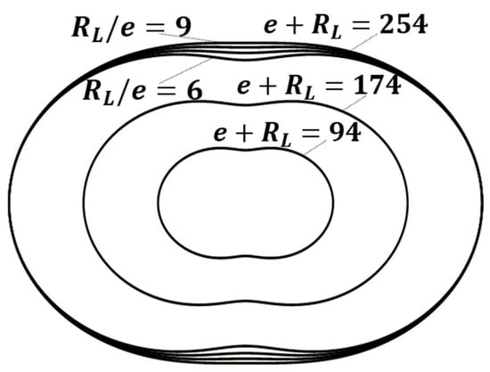 Figure 5 shows the shape and size evolution for the inner rotor using the GP3 design parameters defined earlier, i.e., rotor eccentric length e and shape distance RL = R + r. Rotor size = e + RL was fixed while the ratio k = RL/e, was varied. Inner rotor size also remains constant since the rotor size was fixed. However, the rotor shape becomes more elliptical as k increases, due to the rotor size (e + RL) changing, while retaining the eccentric length and shape distance ratio. Thus, the rotor shape remains the same, only the size increases.