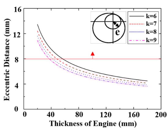 Figure 10 shows the eccentric length with respect to the GP3 design parameters. The power shaft (eccentric shaft) must have sufficient diameter to transmit the power generated by the engine without breaking, but the eccentric length is proportional to the power shaft size and is the most important criterion for engine durability. The eccentric length variance with the design variables at the same delivery volume confirms that the eccentric length decreases as H increases, due to reducing the rotor top surface width, whereas eccentric length increases as k increases. The eccentric length also decreases significantly as thickness increases and decreases slightly as k increases. Therefore, setting engine thickness ≤ 40 mm is more effective in increasing the eccentric length than using k to satisfy the minimum requirement (red line).
