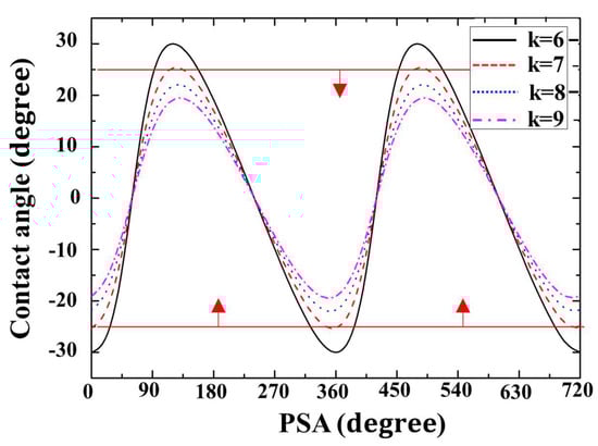 Figure 11 shows the contact angle with respect to GP3 design parameters. As discussed in Section 3.2, the contact angle is an important value for relative sealing degree, and smaller contact angles imply a smaller differential force magnitude, which is favorable for sealing. The contact angle reduces as k increases, regardless of engine thickness, because the contact angle decreases as the rotor shape changes from peanut to elliptical as k increases (see Figure 5). Therefore, optimal k ≥ 7 to satisfy the minimum contact angle requirement ≤ 25 (Figure 11, red line), where momentum magnitude < 10%.