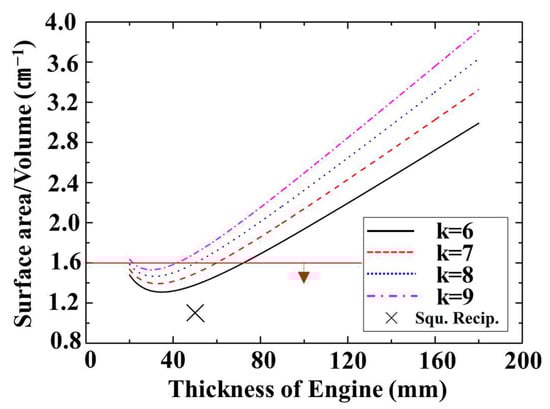 Figure 12 shows the GP3 surface area/volume ratio with respect to the design parameters, with the surface area fixed at the maximum. The GP3 surface area should be designed to minimize heat loss and ensure smooth combustion. The surface area/volume changes are shown with respect to design variables at the same stroke volume. Surface area decreases as thickness increases, reaching the minimum at approximately 30 mm and then increasing again; it also increases with increasing k. The changes as engine thickness increases can be explained by considering the top and bottom engine widths that constitute the cross-sectional area and changes in the engine side width. The top and bottom GP3 engine areas have the same stroke volume for small H (≤30 mm), hence the top and bottom area reduction is larger than the side area increase. On the other hand, the top and bottom rotor area reduction is smaller than the side area increase for larger H (≥30 mm). Therefore, the total surface area of the engine tends to decrease and then increase as motor thickness increases.