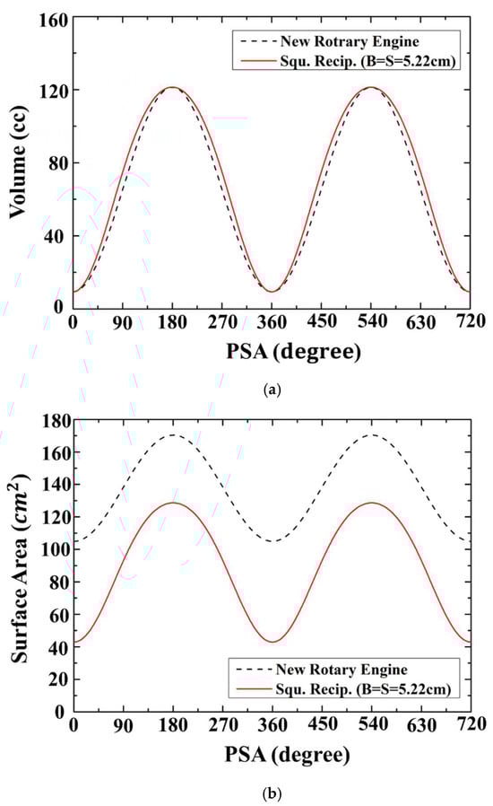 Proposed optimized GP3 engine and typical reciprocating engine parameters. (a) Volume; (b) Surface Area.
