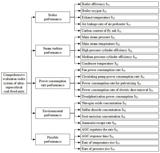The evaluation criteria for coal-fired units are based on current national standards, relevant industry regulations, current management standards and methods of various group companies, and local processes [25]. According to the selection principle of the evaluation index system, through the feasibility analysis of the initial index, combined with the actual situation of the site, the main factors of the coal-fired power plant are decomposed layer by layer, and the evaluation index system of the comprehensive performance of the coal-fired power plant is constructed, including 5 first-level evaluation indicators and 23 second-level evaluation indicators. Figure 1 shows the comprehensive evaluation index system of coal-fired units.