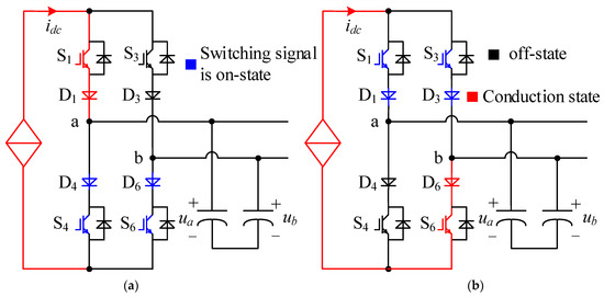 Figure 5a shows the equivalent circuit during the overlap time in the commutation process from the null vector I7 to the active vector I1. At this time, both S4 and S6 are turned on simultaneously, but the flow path of idc depends on the relation of ua and ub.