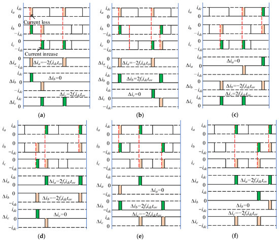 The diagrams of ia, ib, and ic with their error caused by the overlap time in sector II: (a) ua > ub > uc; (b) ua > uc > ub; (c) ub > ua > uc; (d) ub > uc > ua; (e) uc > ua > ub; (f) uc > ub > ua.