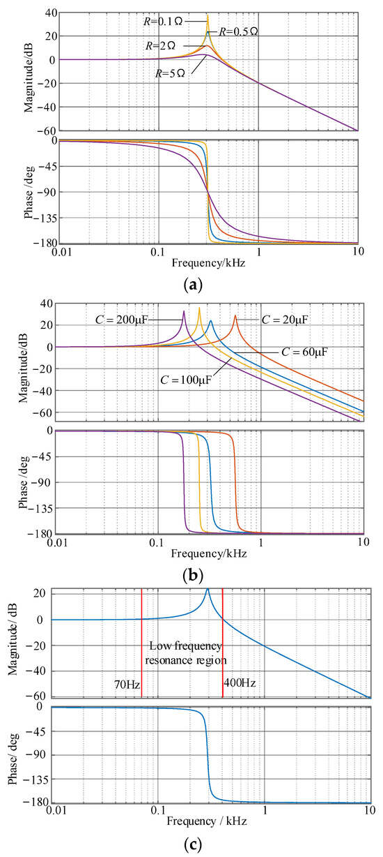 Bode plot of Gi2ig(s): (a) different R; (b) different C; (c) parameters determined in this paper.