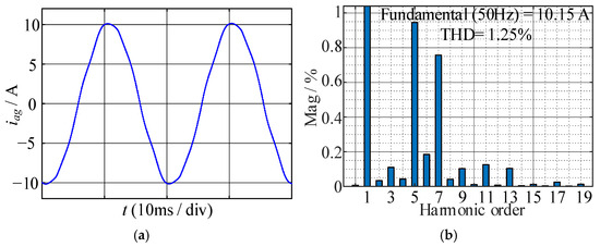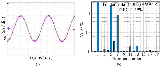 After the proposed current error compensation is introduced into the control algorithm, the experimental waveform and FFT result of iag are shown in Figure 18; after compensation, the fundamental amplitude increase from 9.69 A to 9.95 A, the amplitudes of the fifth and seventh harmonics are reduced to 0.119 A and 0.097 A, and the THD decreases from 5.93% to 1.95%.