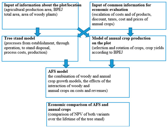 In order to estimate the minimum price of production (woodchips, fruit) providing the required return on invested capital (for the establishment and operation of the AFS) according to Formula (3), economic models capturing the entire life cycle of a stand of trees from the establishment of the stand, through maintenance and the harvesting of the production, to disposal can be used. The following basic principles apply to the development of these models (see [43]):