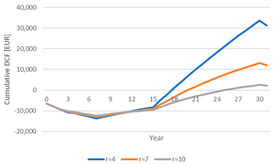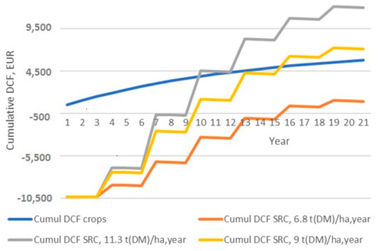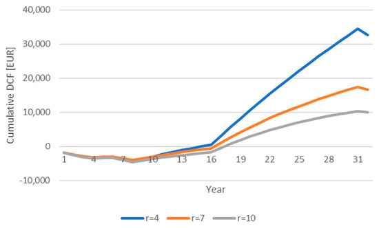 A number of authors emphasize both the higher level of risk associated with perennial energy crops compared to conventional agricultural production [45,46,47] and the opportunity cost principle when modelling the price of biomass from energy crops on agricultural land. Higher business risk is due to the high cost of establishing the tree plantation and the higher risks of losing both production (e.g., fruit) and the entire plantation (e.g., in case of bad weather in the first years after the establishment of the AFS). The higher business risk is then reflected in the higher value of the discount used to discount the cash flows associated with the tree plantation. At the same time, different types of tree plantations (i.e., different AFS types) generally have different business risk. For example, fruit trees will be riskier in terms of loss of production yield (due to inclement weather) compared to SRC plantations. Thus, SRC plantations generally have less sensitivity to weather fluctuations.