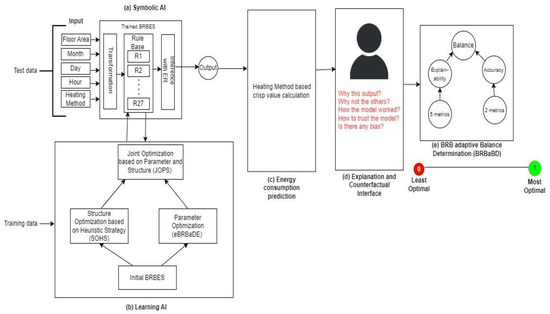 Biessmann et al. [36] employed an Automated Machine Learning (AutoML) approach to predict the energy demand of large public buildings across various building categories. They provided building features and climate features (yearly aggregates) as input to this AutoML model. The building features are area, building category, energy efficiency measures, and consumption in past years. The climate features are temperature, sunshine hours, cloud cover, wind, and humidity. Their proposed approach showed higher prediction accuracy to model the energy demand pattern compared to the adapted and optimized Bundesinstitut für Bau-, Stadt- und Raumforschung (BBSR) approach. However, this AutoML approach does not provide any explanation in support of the predictive output. Dinmohammadi et al. [37] predicted heating energy consumption of residential buildings using advanced machine learning algorithms. They identified the most important features contributing to residential energy consumption by employing a Particle Swarm Optimization (PSO)-optimized Random Forest classification algorithm. They applied a Self-Organizing Map (SOM) approach to reduce feature dimensionality and then trained their proposed stacking method-based ensemble classification model with the dimensionality-reduced data to classify heating energy consumption. This stacking method included Extreme Gradient Boosting (XGBoost), Random Forest, and Light Gradient-Boosting Machine (LightGBM), which showed superior performance to other traditional methods. Dinmohammadi et al. [37] also proposed a causal inference graph, in addition to SHAP, to explain the factors influencing energy consumption. However, none of the three machine learning models of their stacking method incorporates domain knowledge. Hence, the feature importance, explained by the causal inference graph, is also ad hoc. Spinnato et al. [38] proposed LASTS (Local Agnostic Subsequence-based Time Series explainer) to disclose the logic of a black-box model, which classifies time series data. This XAI method explains the reasons of an opaque model’s decision through three different representations: saliency-based explanation, instance-based explanation, and rule-based explanation. Saliency-based and instance-based explanations are not based on domain knowledge. Moreover, rules of their rule-based explanation were inferred from a decision-tree surrogate. Hence, these rules cannot deal with data uncertainties. Guidotti et al. [39] employed stable and actionable Local Rule-based Explanation (LOREsa) method to explain black-box models. They computed such explanations from a decision tree, which imitated the behavior of the model locally with respect to the instance to explain. They used a bagging-like approach to formulate this decision tree, which had both stability and fidelity. They merged the ensemble decision tree into a single one. A genetic algorithm was used to synthetically generate neighbor instances to learn the ensemble of decision trees. But, unlike a BRBES, a decision tree cannot address data uncertainties.
