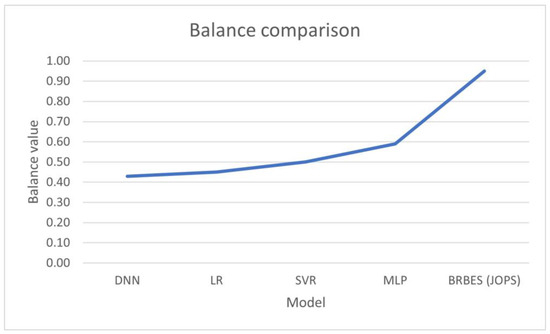 The second part is partially pragmatic due to the high conversion cost to shift from electric to district heating. Connectedness is 100% as the counterfactual is fully consistent with the rule base (ground-truth) of the BRBES. These two counterfactual metrics, as shown in the last two columns of Table 8, are not relevant for four models as they do not produce any counterfactual. We show the comparative values of explainability and accuracy (as predicted by the first layer of BRBaBD) of the JOPS-optimized BRBES and four models in Figure 2. The balance between explainability and accuracy of the JOPS-optimized BRBES and four models are demonstrated in Figure 3. The JOPS-optimized BRBES has higher balance than the four models. Thus, our proposed eBRBES framework outperforms state-of-the-art models in terms of both explainability and accuracy.