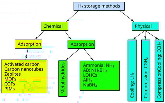 Chemical methods of storing hydrogen are based on adsorption and absorption processes. Adsorption methods include, for example, hydrogen adsorption on activated carbon grains, adsorption in carbon nanotubes, hydrogen adsorption in zeolites, and in complex structures: covalent organic frameworks (COFs), metal–organic frameworks (MOFs), and polymers of intrinsic microporosity (PIMs). Absorption methods involve the absorption of hydrogen in solutions, e.g., ammonia, ammonia borane, and liquid organic hydrogen carriers (LOHC), that can absorb and release hydrogen through chemical reactions and metal hydrides.