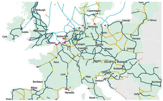 Figure 7 shows the planned European hydrogen distribution network (The European Hydrogen Backbone) [71]. Dark lines indicate existing pipelines that will be adapted to transport hydrogen, and yellow lines indicate new ones, dotted lines represent undersee pipelines and stars indicate cities. In a well-managed system with low leak rates, both green hydrogen and to a lesser extent blue hydrogen would significantly reduce warming compared with fossil fuels [72].